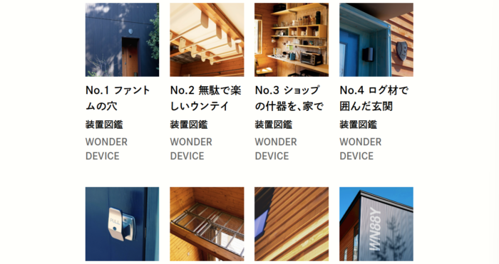 ホームページの最大の特徴は、注文住宅のサービスページや施工事例がカタログのように一覧表示されており、ユーザーが視覚的に情報を得られる点です。カテゴリ別に分類された事例を画像と共に掲載することで、「この会社に依頼したらどんな家になるか」が直感的に伝わるUI設計となります。